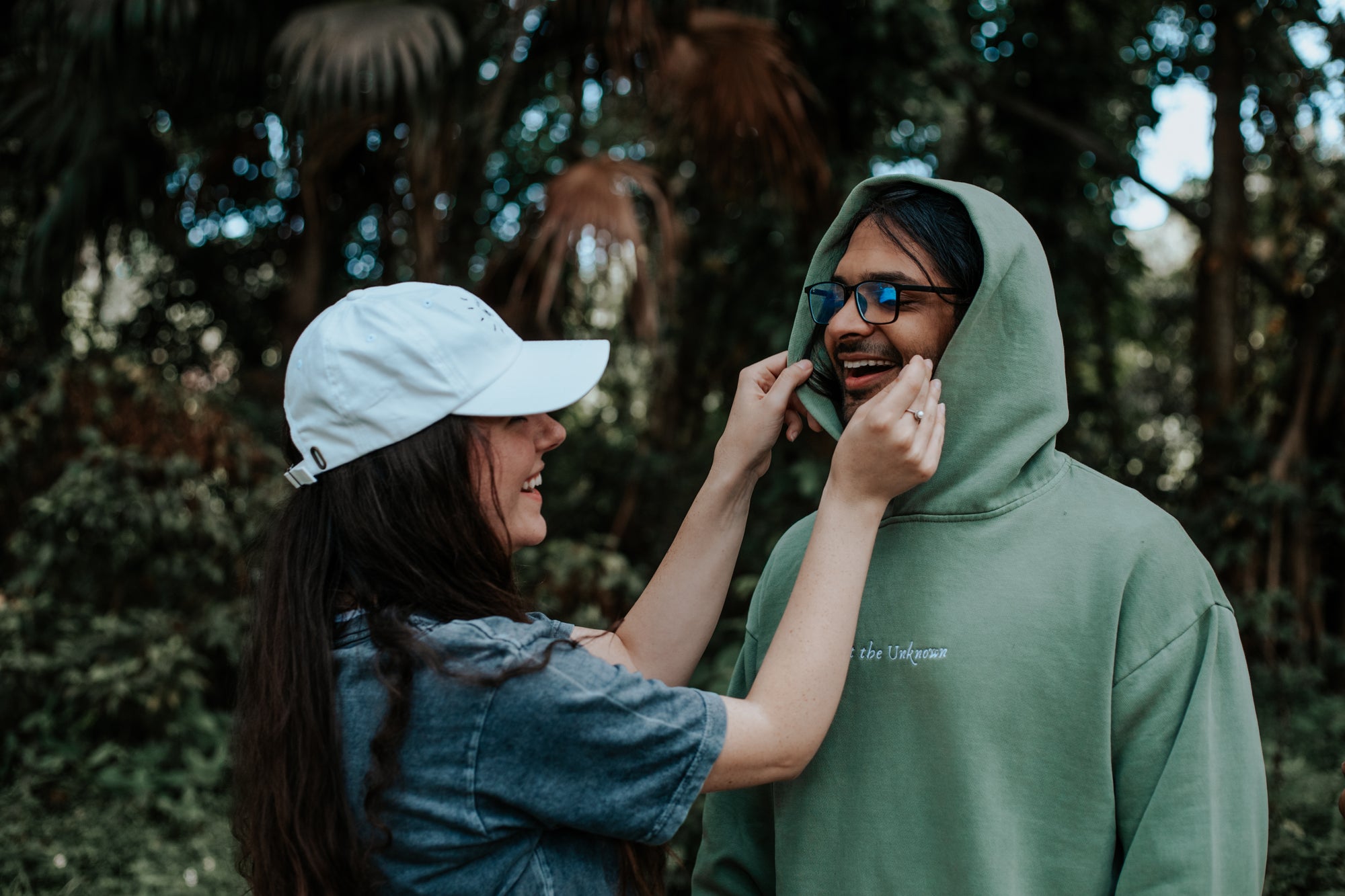 "Our relationship was built on the foundation of trusting the unknown. We met by chance, even though we live on opposite sides of the country, at an event for over 10,000 people. As fate would have it, we ended up getting assigned to a small team of around 15 members and were able to connect on a deep level because of it. Throughout the years we stayed in touch, always talking about our love for personal growth and spirituality. As we continued to grow closer, the universe began to play a hand in creating our relationship. We even ended up meeting at a sold out spiritual event and managed to get us both tickets and a free stay at the resort. Giving into the flow of life is what deepened our bond and we carry this message in the love we share together."